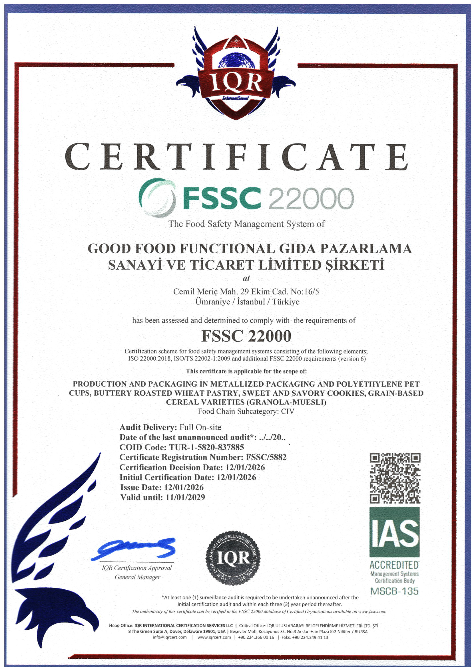 Good Food olarak üretim süreçlerimizde kalite, güvenlik ve uluslararası standartlara tam uyum temel prensibimizdir. Tüm üretim faaliyetlerimiz; gıda güvenliği, izlenebilirlik ve kalite yönetimi standartlarına uygun şekilde yürütülür.